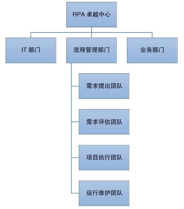 RPA卓越中心(Center of Excellence,CoE)即在全行內部建立自動化核心小組,將RPA工具深入有效地嵌入組織中,對RPA項目的總體治理提供指導,并執行和監測RPA項目的整個生命周期。一個跨職能的卓越中心能在未來的部署中重新分配知識、調配資源,有利于形成改善運營、協同增效、持續優化的整合式發展局面。該類卓越中心一般是由IT部門、流程管理部門、業務部門構成的虛擬管理組織。其中,業務部門負責提出業務訴求與收益評估、參與自動化流程設計、測試驗收、用戶培訓、流程監測與變更管理;IT部門負責技術工具評估、架構設計、流程開發與交付、開發規范管理與運維管理、供應商管理與后評價;流程管理部門承擔RPA整體運營規劃職責,負責RPA運營策略規劃、自動化評估及機會識別與評估、定期統籌全行自動化收益評價。