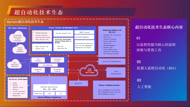 此外,流程挖掘和任務挖掘技術也在超自動化中扮演著重要角色。通過大數據技術的建模,可以從端到端展示企業的智能化流程,幫助企業更好地理解和優化其業務流程,進一步提升整個企業的經營質效。